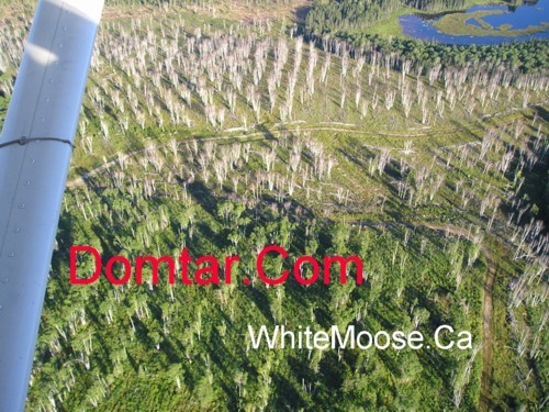 The cut block is approximately 3 miles North-East of Oswald lake ... which is approximately 15 miles North East of my home. I confirmed for my own eyes this summer that the cause of the dead birch trees was the herbicides. Last fall, I flew over my favorite bear hunting area to find a helicopter spraying herbicides on the berry patch. This summer, the spray lines were clearly visible with live trees marking the border of the spray. Multi-national forestry companies are hi-grading the forest and destroying future employment opportunities in the region due to wasteful harvest techniques. When will they stop leaving full grown poplar, birch, cedar, and pine in the bush to rot? If the multi-national forestry company knows that the remaining "MERCHANTABLE" trees will be killed when herbicides are applied, why leave them standing?